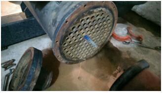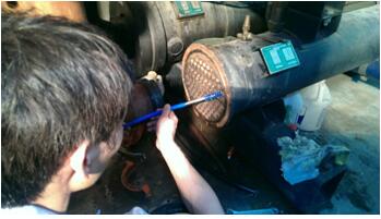 4、 打開冷凝器端蓋,用沖炮機清刷第根銅管